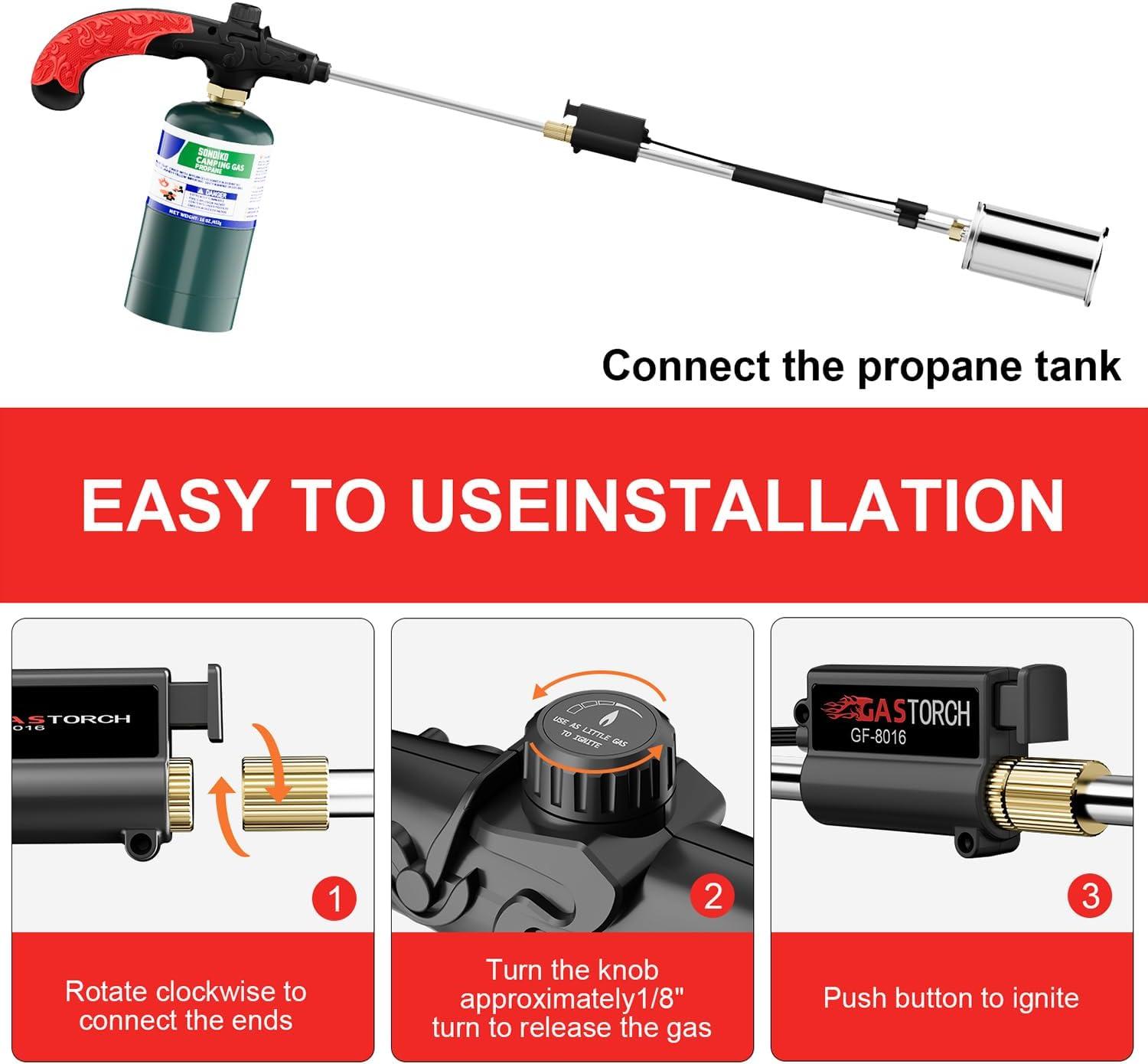 【High Safety and Double Guarantees】100% passed high standard leak test before shipping. This propane weed torch also contains internal safety mechanisms that restricts 99% of propane flow, in case of leakage. All steel parts are built with heat-stable steel, enhanced anti-corrosion eliminated risk of leakage in long time.