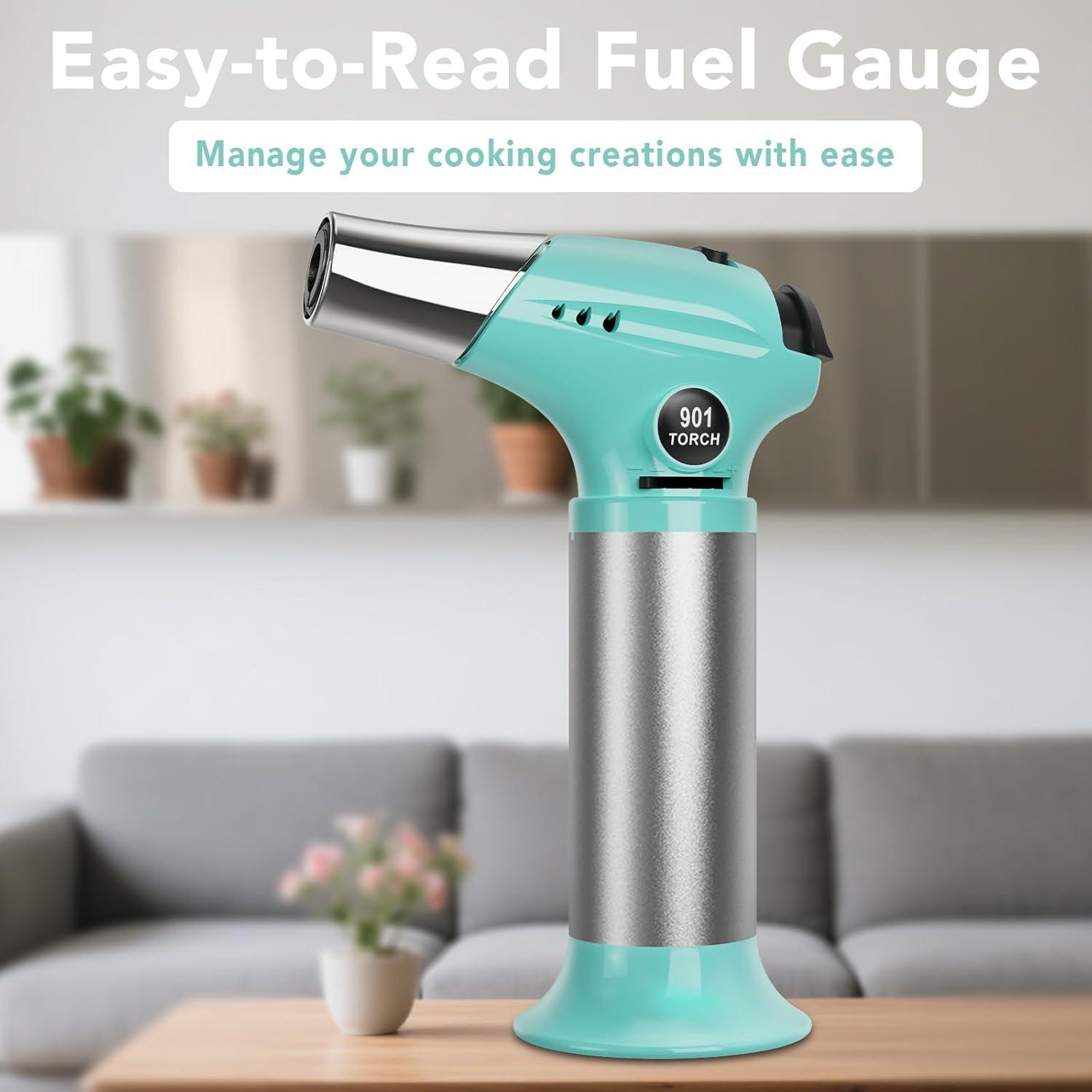 【Premium Fuel Gauge】Sondiko kitchen torch is equipped with a transparent fuel gauge on the bottom, enabling you to know the remaining gas at any time and thus better manage your cooking creation. What’s more, the easy-to-read fuel gauge with MAX line also functions as a reminder to avoid overfilling. 10g large fuel gas capacity lasts 20-50 minutes each full refill with stable
