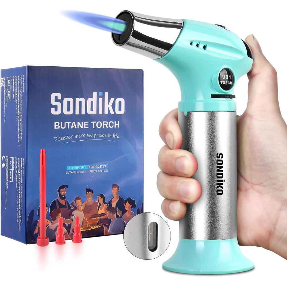 【Professional Culinary Torch, Sondiko Brand】Safe and Durable – With safety lock prevents accidental ignition and a wide set base helps to prevent it falling over. Long angled nozzle and burn-free finger guard keep your hand safely away from the flame. Made with durable Aluminum alloy body for long lasting use.