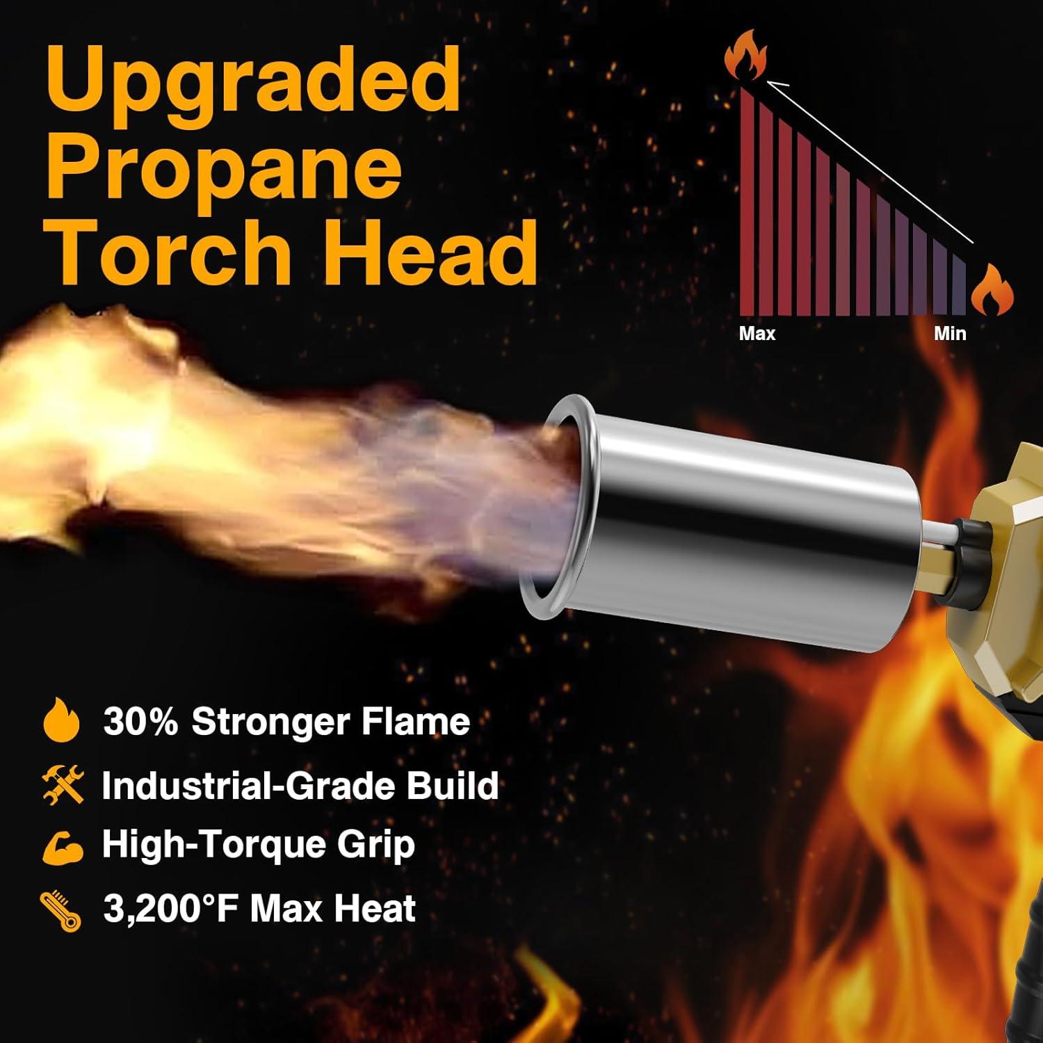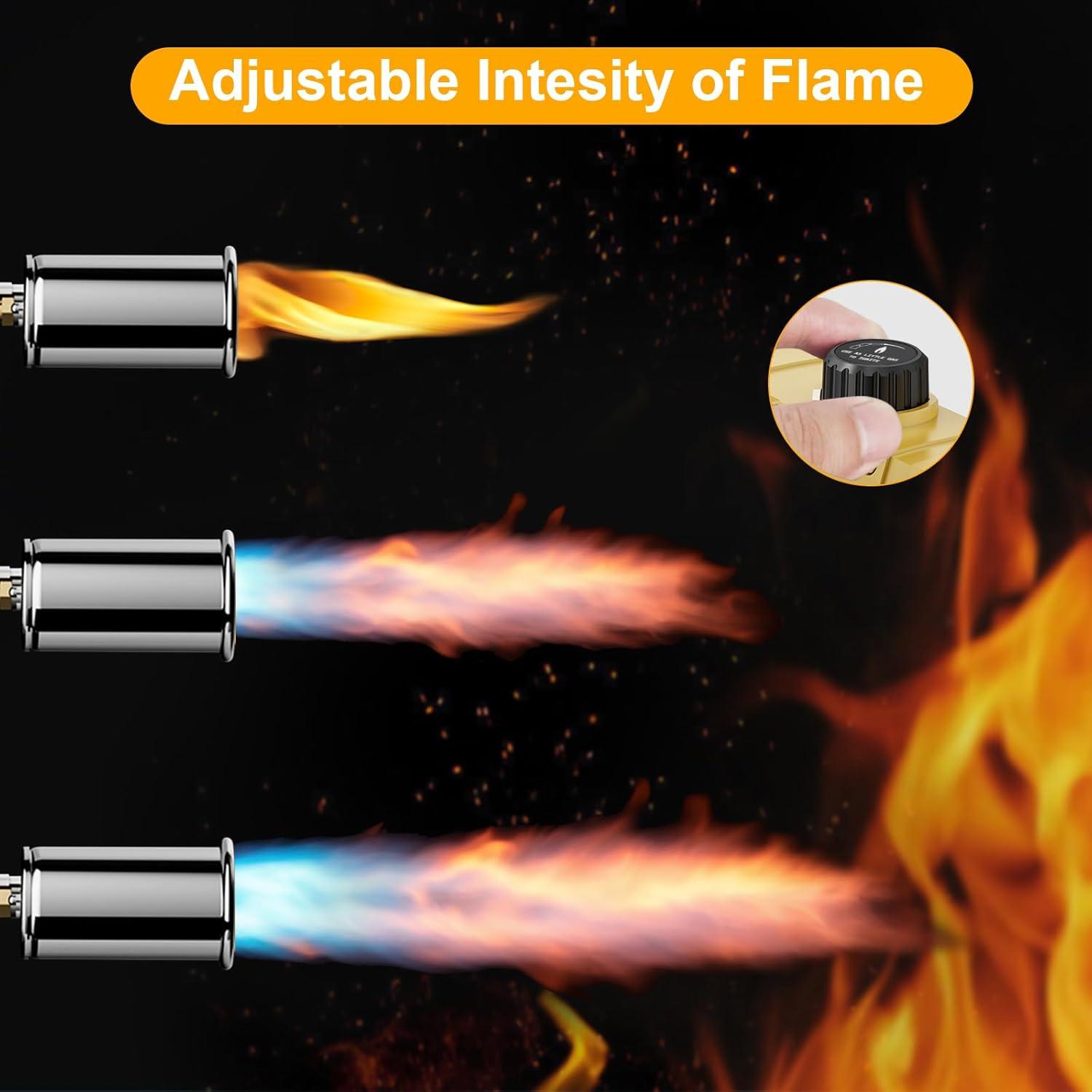 Precise Flame Control: Easily adjust the flame intensity by turning the fuel knob. Rotating counterclockwise to increase fuel flow and flame size, and rotate clockwise to decrease fuel flow and flame size. This meater torch also features an extended angled nozzle and a burn-free protective shield to keep your hands away from the flame, ensuring safety.