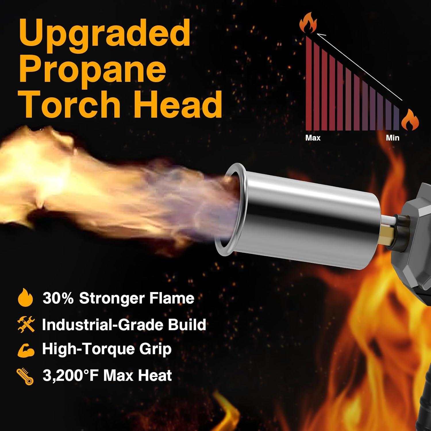Newest Design – Reinforced Structure: This newly upgraded blow torch includes a front handle, making it more comfortable for two-handed operation. By evenly distributing pressure, it enhances flexibility and reduces fatigue during use. The entire torch is made from high-quality materials, built to withstand the harshest conditions, ensuring long-lasting performance whether you're cooking, camping, or handling DIY projects.